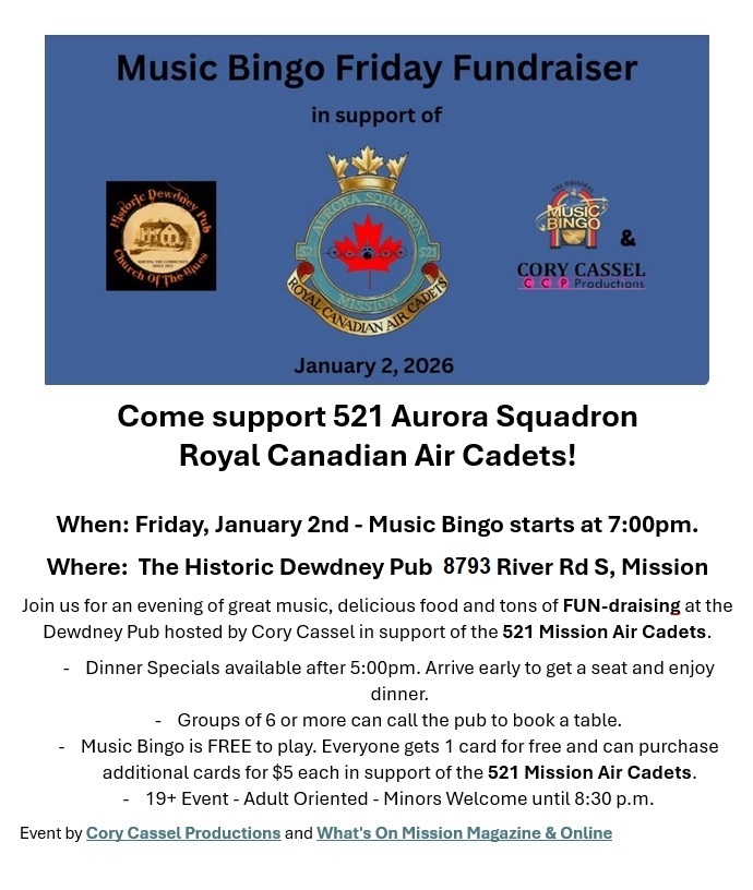 Our fundraiser takes place on Jan 02 2026 at the Historic Dewdney Pub, 8793 River Road South, for 7pm. For more information, click on the link: https://www.facebook.com/events/s/music-bingo-friday-fundraiser-/1812065059420512